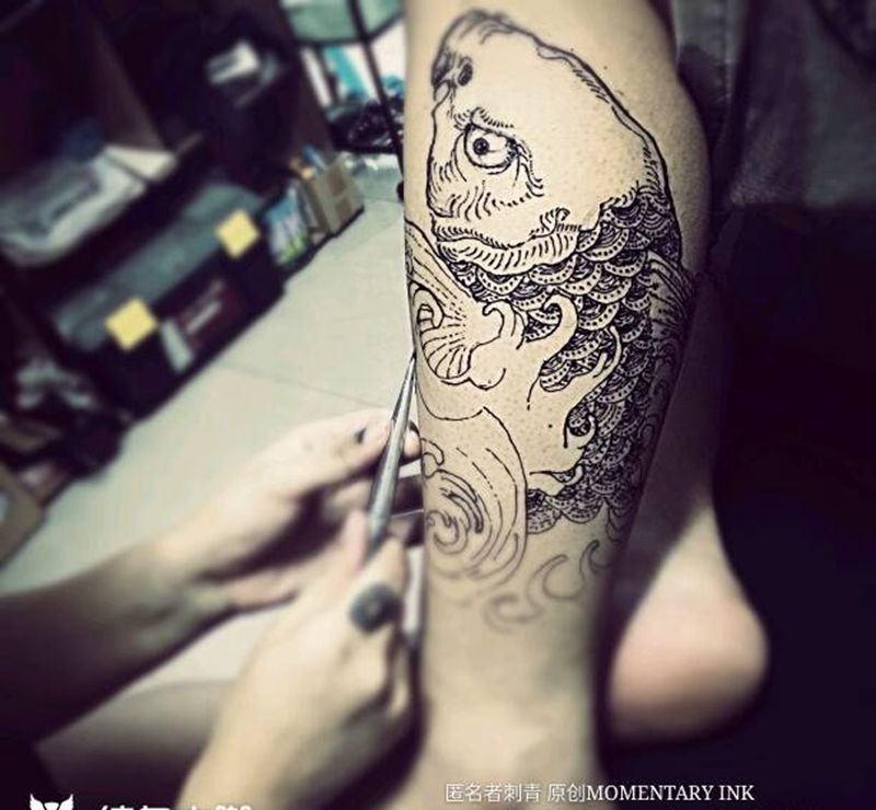 招财鲤鱼纹身图片_腿部传统国画动物原创艺术黑灰海娜成品纹身图案