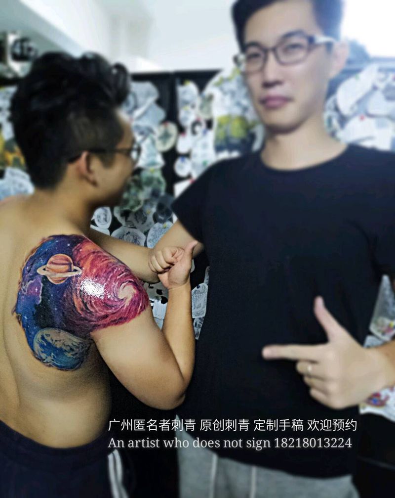 广州匿名者刺青 定制幻彩星云纹身图片_肩部背部手臂欧美写实原创广州宇宙星云成品手稿纹身图案
