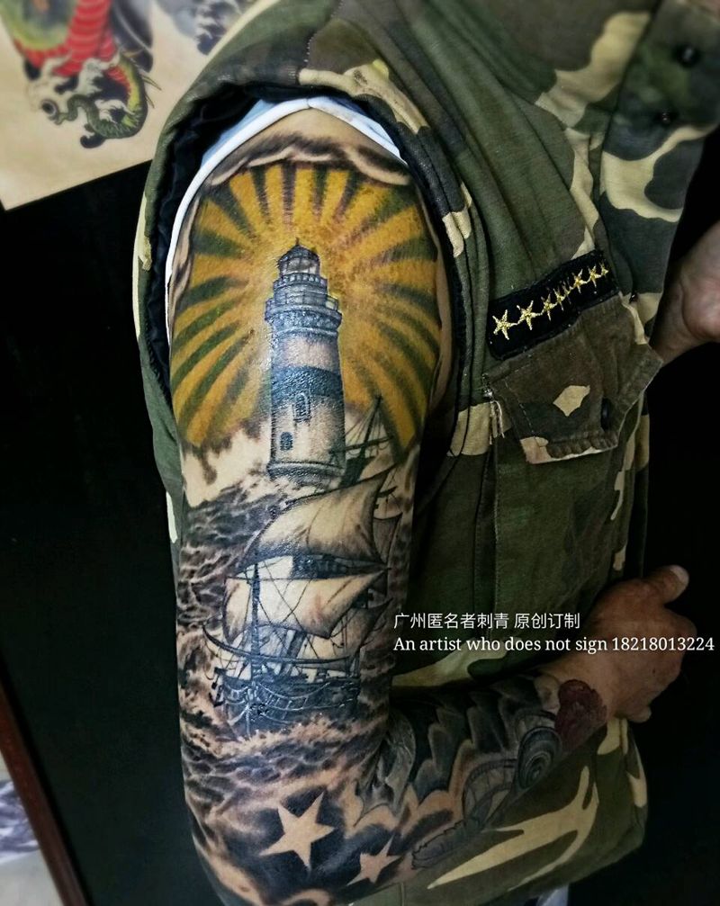 当前位置: 首页 >广东省广州市纹身店-广州匿名者刺青纹身图案>帆船灯塔包臂纹身图片_手臂欧美写实原创广州成品纹身图案