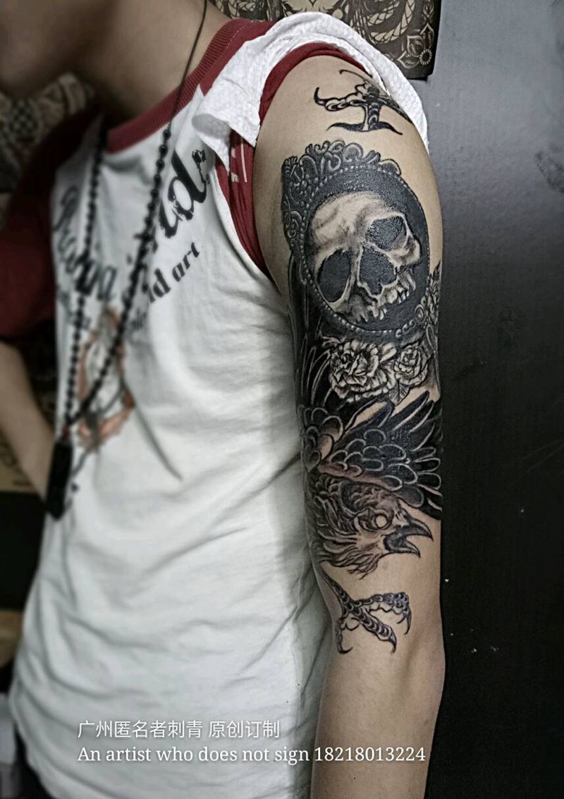 骷髅 乌鸦纹身图片_手臂欧美写实动物静物原创广州骷髅乌鸦成品纹身图案
