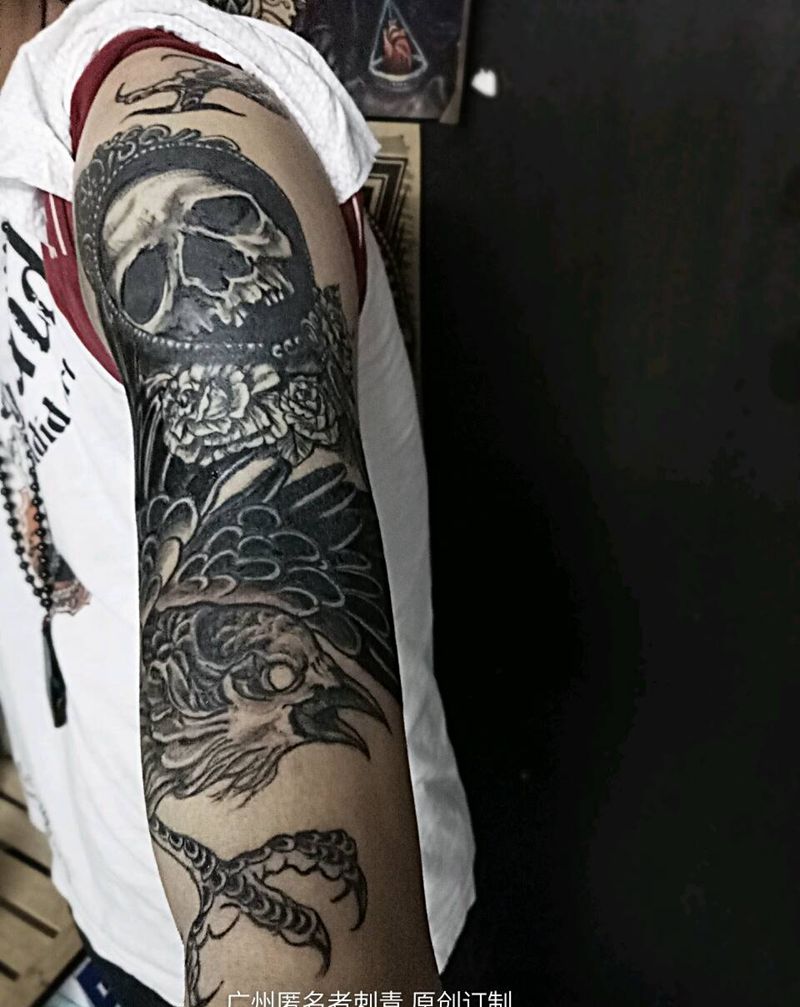 骷髅 乌鸦纹身图片_手臂欧美写实动物静物原创广州骷髅乌鸦成品纹身图案