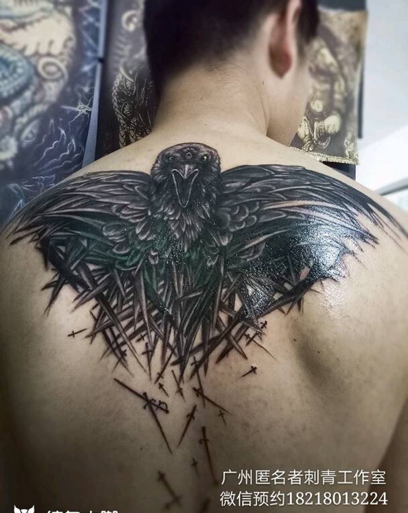 三眼乌鸦遮盖图纹身图片_背部欧美写实动物宗教原创广州遮盖乌鸦成品纹身图案