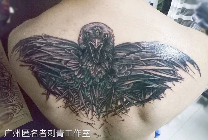三眼乌鸦遮盖图纹身图片_背部欧美写实动物宗教原创广州遮盖乌鸦成品纹身图案