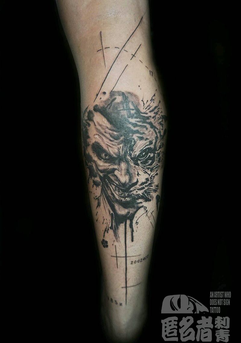 当前位置: 首页 >广东省广州市纹身店-广州匿名者刺青纹身图案>写实泼墨小丑老虎纹身图片_腿部肖像写实动物人物原创广州成品纹身图案