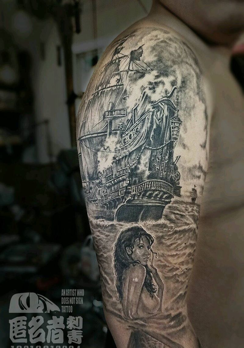 当前位置: 首页 >广东省广州市纹身店-广州匿名者刺青纹身图案>加勒比海美人鱼包臂纹身图片_肩部手臂欧美肖像写实人物鬼神原创广州成品纹身图案