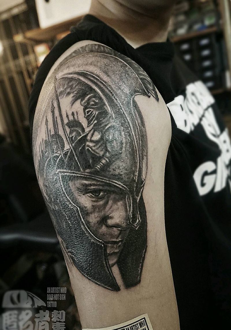 覆盖作品 战神阿琉喀斯纹身图片_手臂腿部肖像写实人物原创广州匿名者成品纹身图案