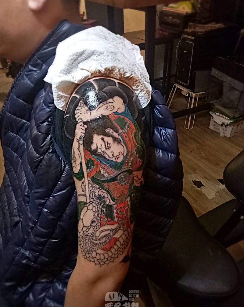 日式包臂 进度一纹身图片_手臂传统国画动物人物鬼神原创广州成品纹身图案