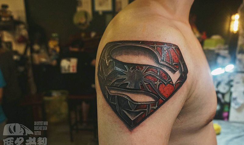 当前位置: 首页 >广东省广州市纹身店-广州匿名者刺青纹身图案>彩色写实 合体超人蜘蛛侠纹身图片_手臂欧美写实人物图腾原创广州成品纹身图案