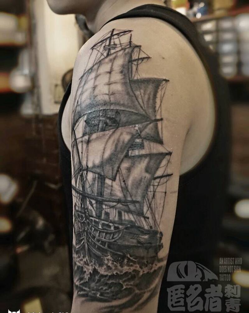 当前位置: 首页 >广东省广州市纹身店-广州匿名者刺青纹身图案>帆船纹身图片_肩部手臂欧美写实静物原创成品纹身图案