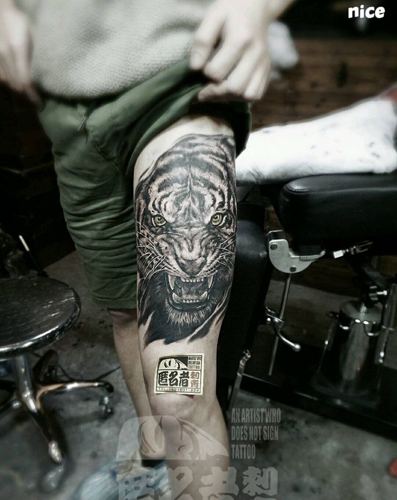 当前位置: 首页 >广东省广州市纹身店-广州匿名者刺青纹身图案>写实老虎纹身图片_腿部写实动物原创广州成品纹身图案