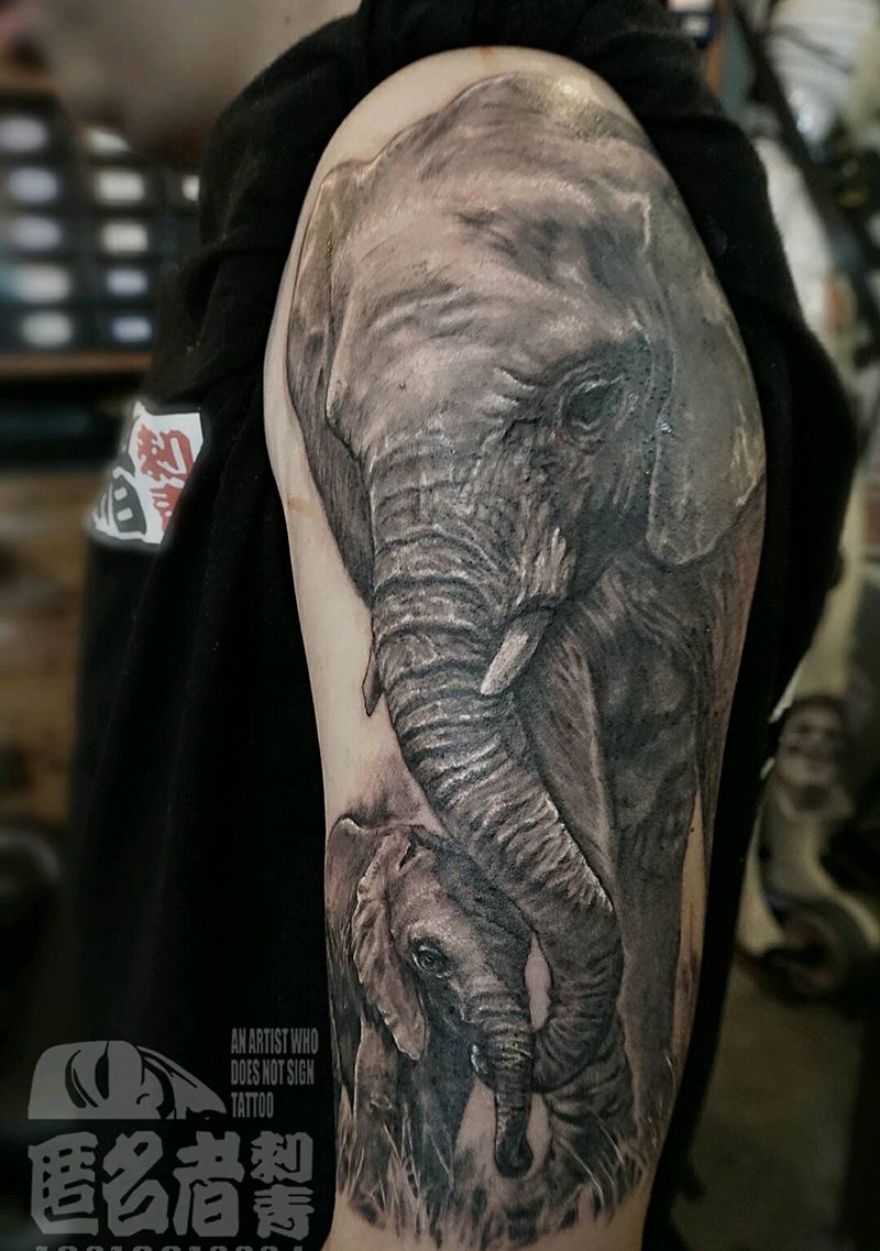 当前位置: 首页 >广东省广州市纹身店-广州匿名者刺青纹身图案>写实 母子象纹身图片_肩部手臂欧美写实动物原创广州成品纹身图案