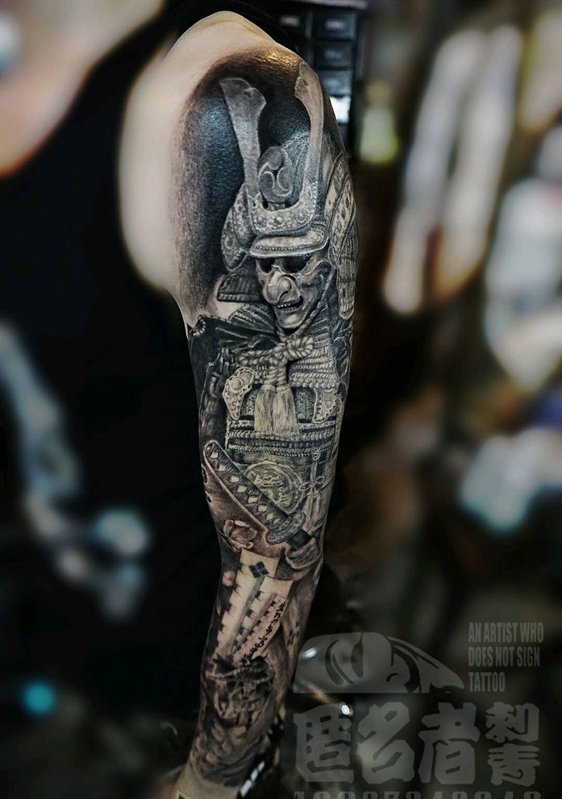 当前位置: 首页 >广东省广州市纹身店-广州匿名者刺青纹身图案>武士包臂纹身图片_肩部手臂欧美传统肖像写实人物鬼神原创成品纹身图案