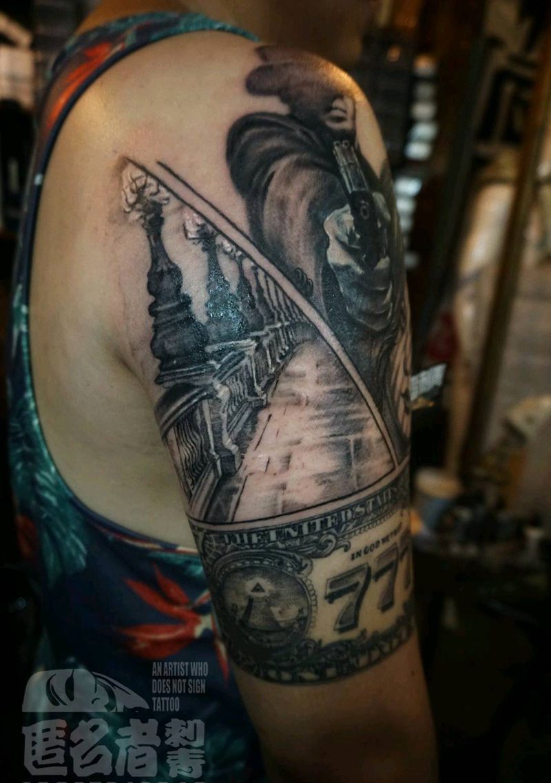 当前位置: 首页 >广东省广州市纹身店-广州匿名者刺青纹身图案>美国往事 拼贴纹身图片_手臂欧美肖像写实人物原创成品纹身图案