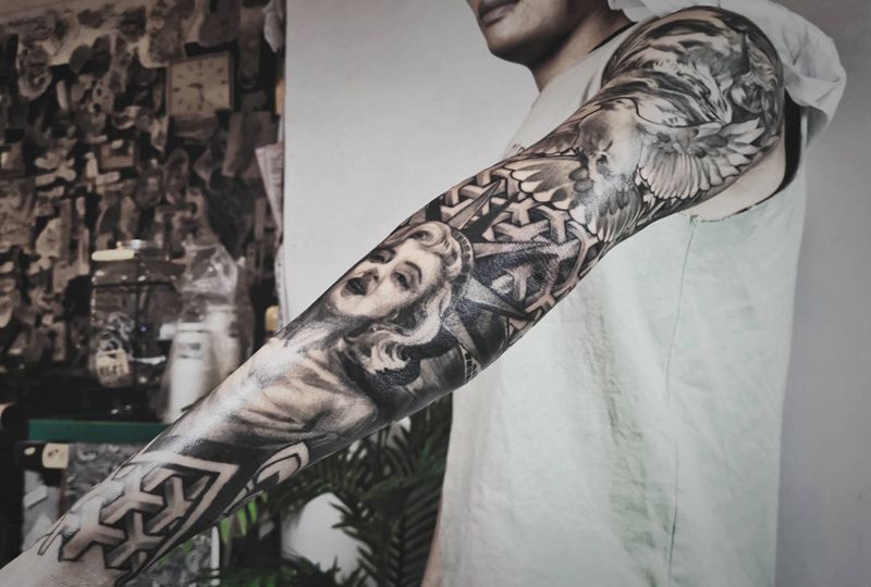 当前位置: 首页 >广东省广州市纹身店-广州匿名者刺青纹身图案>写实风格神话.人物包臂纹身图片_手臂欧美写实波塞冬梦露包臂纹身图案