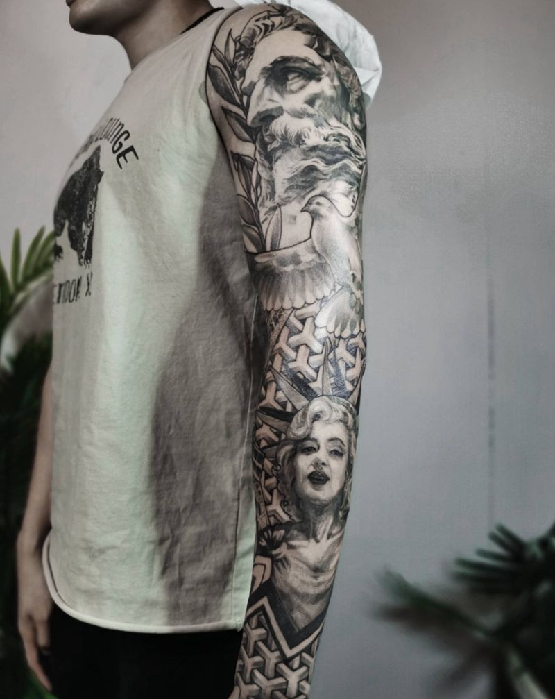 写实风格神话.人物包臂纹身图片_手臂欧美写实波塞冬梦露包臂纹身图案