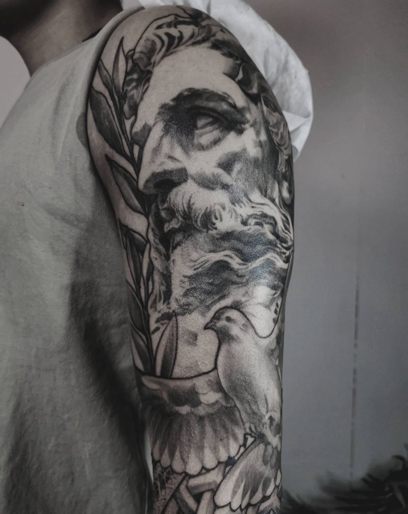 写实风格神话.人物包臂纹身图片_手臂欧美写实波塞冬梦露包臂纹身图案