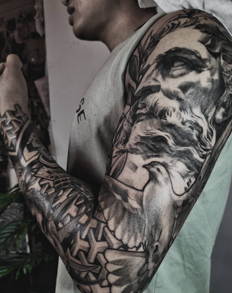 写实风格神话.人物包臂纹身图片_手臂欧美写实波塞冬梦露包臂纹身图案