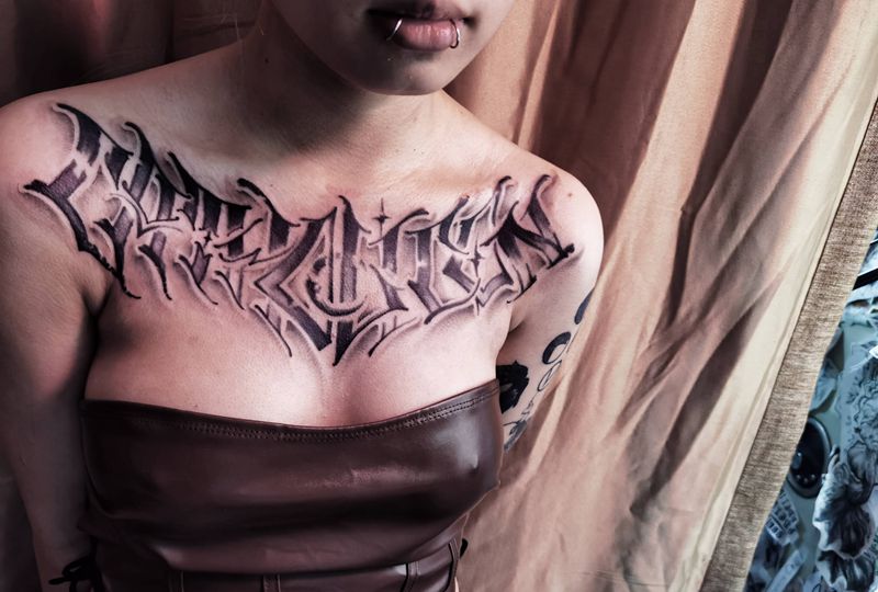 美胸一枚纹身图片_胸部花体字女生性感纹身图案