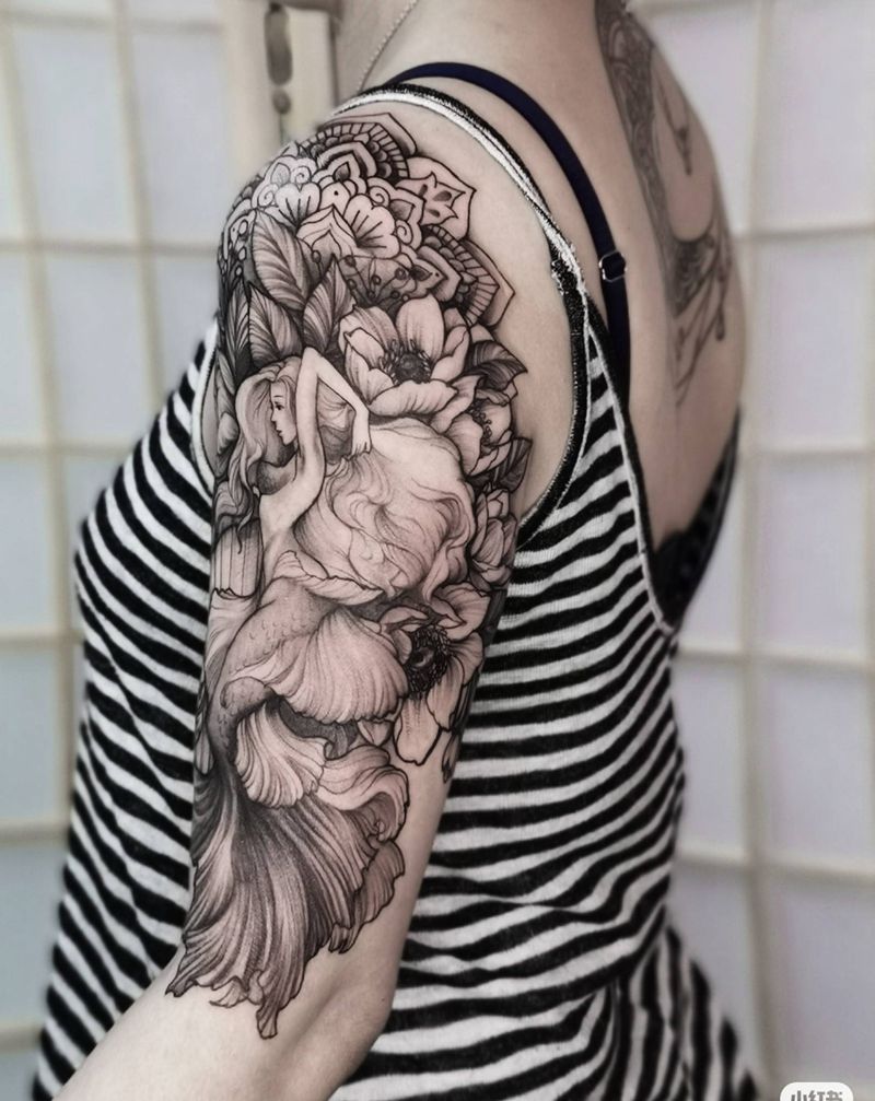 美人鱼纹身图片_手臂欧美写实美人鱼素花曼陀罗纹身图案