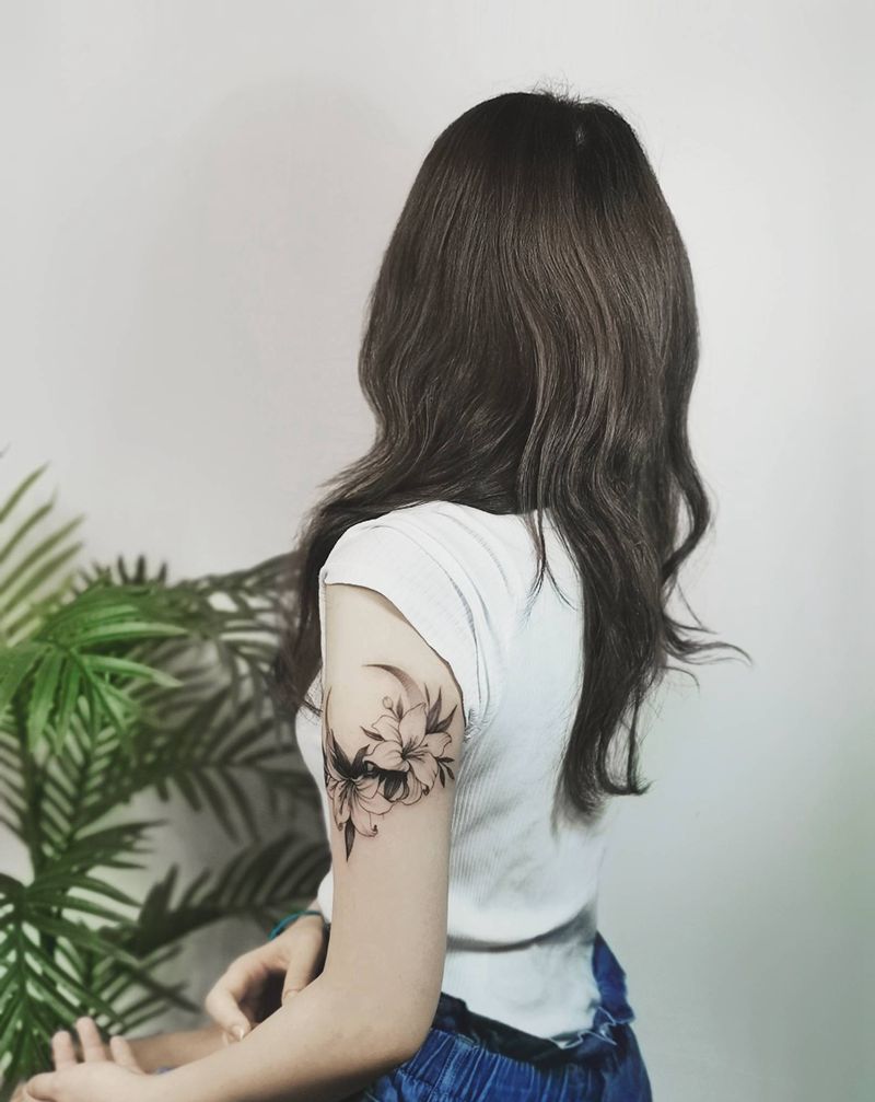 遮盖作品纹身图片_手臂百合月亮遮盖纹身图案