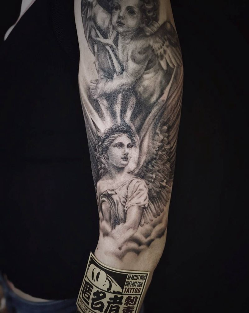 天使和丘比特纹身图片_手臂欧美写实天使丘比特包臂纹身图案