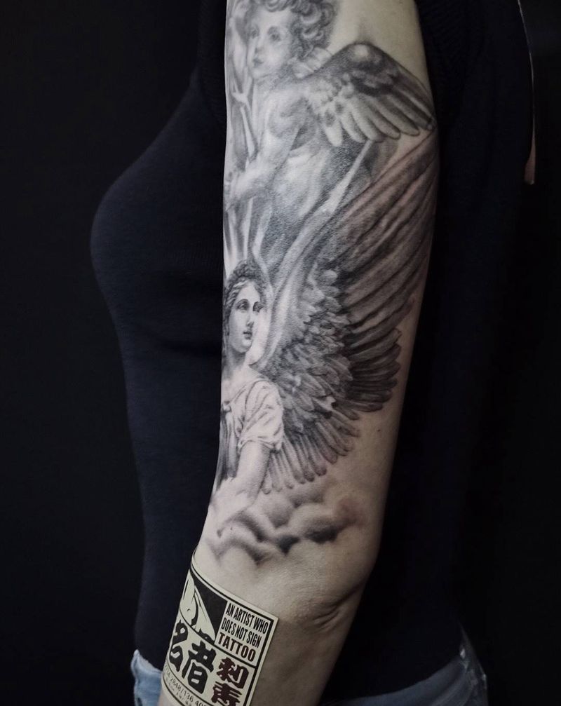 天使和丘比特纹身图片_手臂欧美写实天使丘比特包臂纹身图案