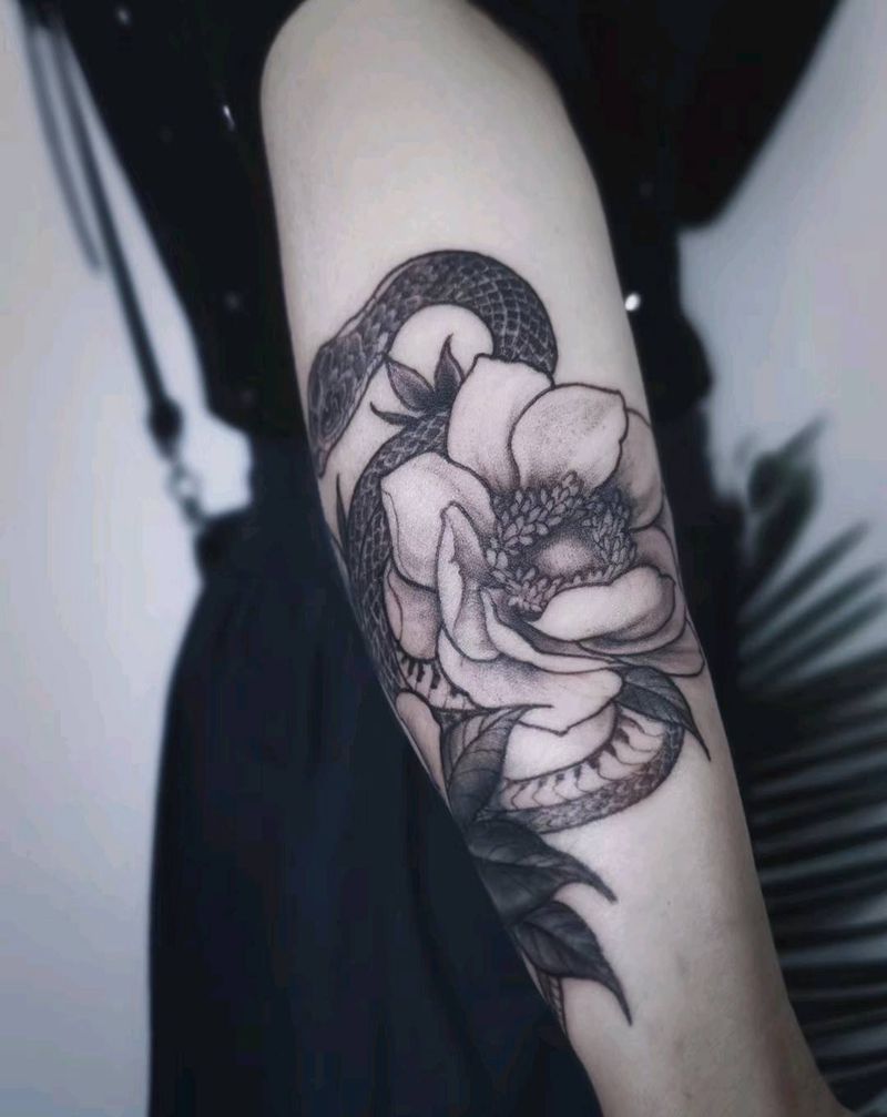 花与蛇纹身图片_手臂插画蛇花纹身图案