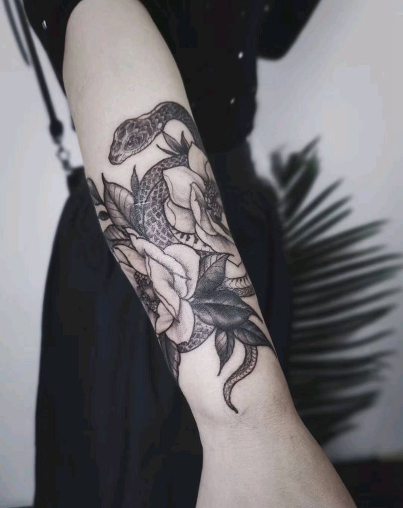 花与蛇纹身图片_手臂插画蛇花纹身图案