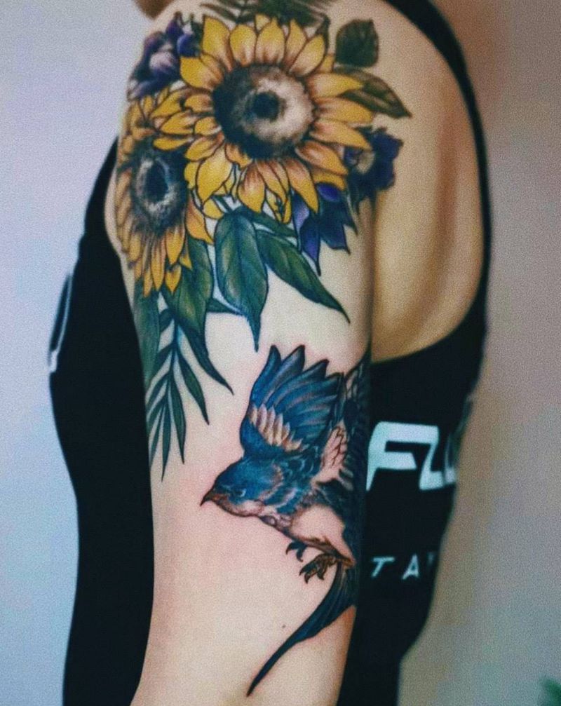 向日葵和愤怒的小鸟纹身图片_手臂New School向日葵鸟花鸟纹身图案