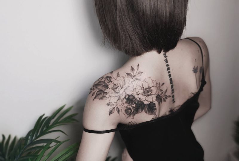 遮盖作品-茶花包肩纹身图片_肩部素花遮盖花肩纹身图案