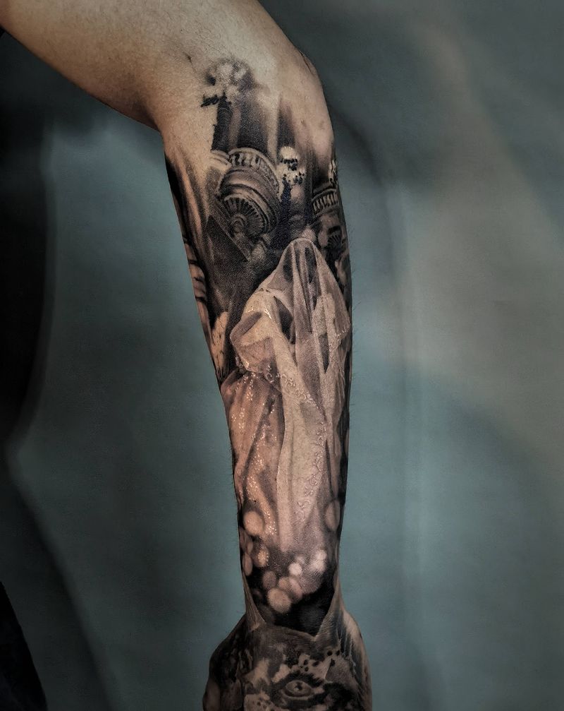 当前位置: 首页 >广东省广州市纹身店-广州匿名者刺青纹身图案>写实风格包小臂纹身图片_手臂欧美写实肖像桃花婚纱纹身图案
