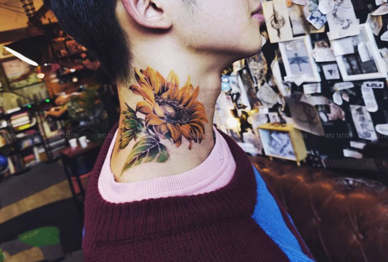 向日葵纹身图片_颈部欧美写实植物 向日葵彩色写实纹身图案