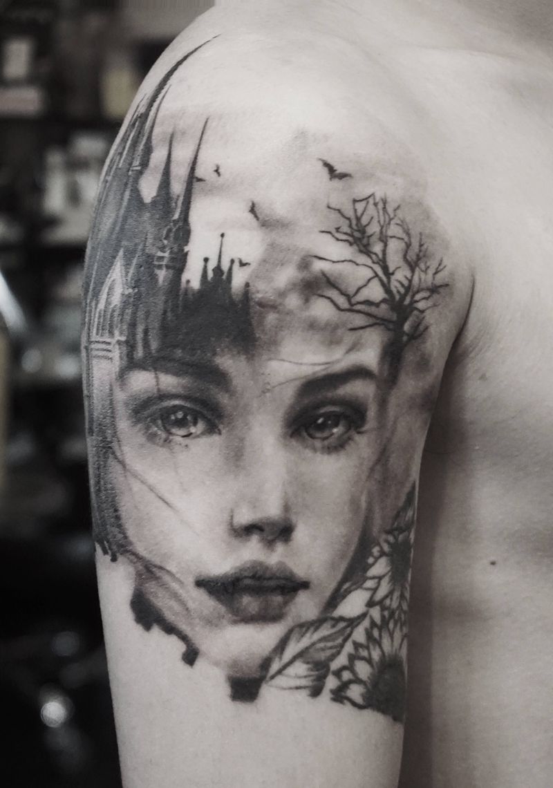 当前位置: 首页 >广东省广州市纹身店-广州匿名者刺青纹身图案>美女肖像与建筑纹身图片_手臂欧美写实美女建筑天使纹身图案