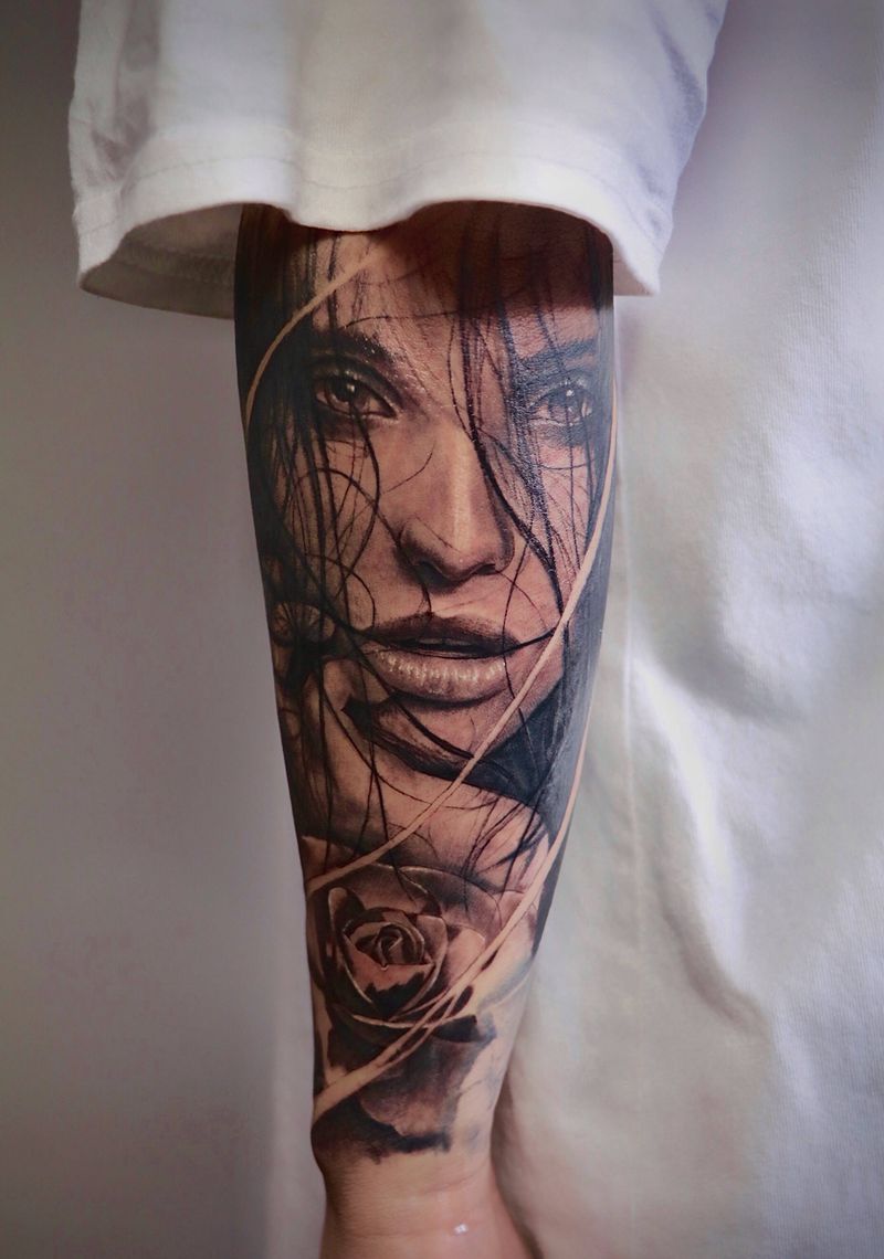 拼接小臂纹身图片_手臂手部欧美写实人物肖像玫瑰花纹身图案