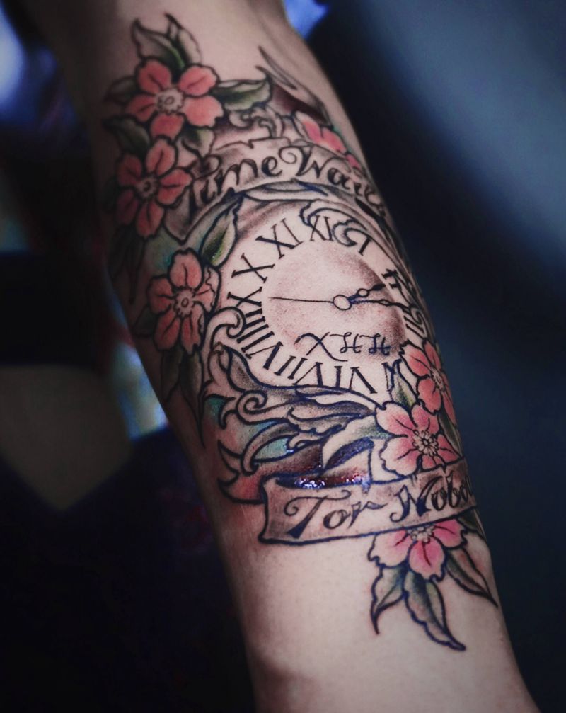 当前位置: 首页 >广东省广州市纹身店-广州匿名者刺青纹身图案>时钟old school纹身图片_手臂Old School时钟桃花樱花纹身图案