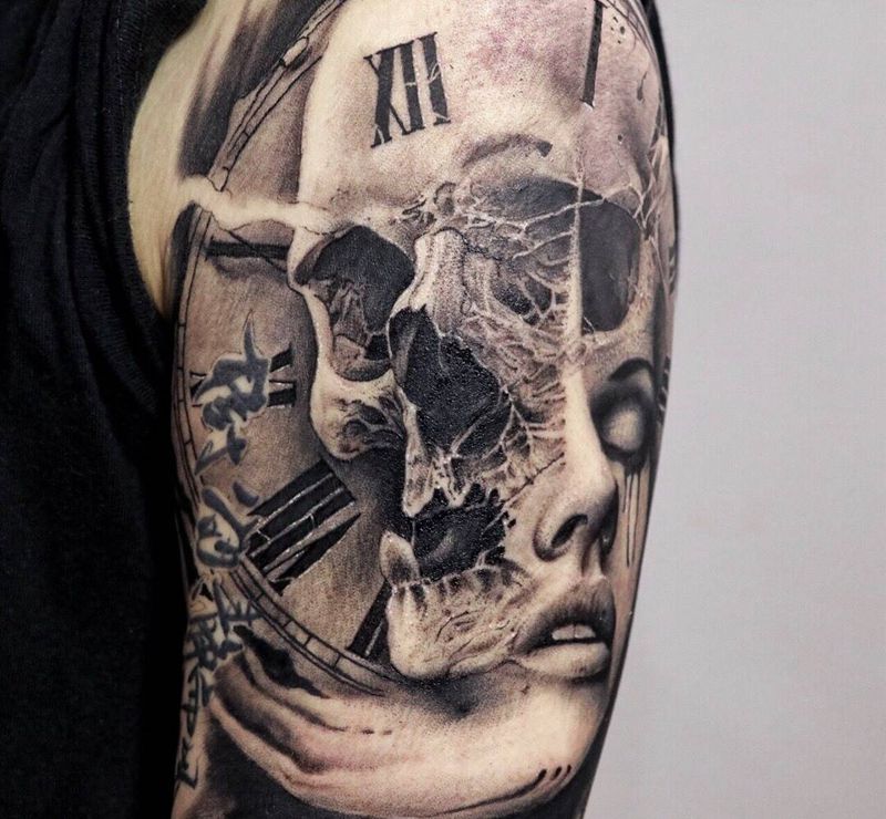 当前位置: 首页 >广东省广州市纹身店-皓龙纹身工作室纹身图案>骷髅纹身图片_手部手臂欧美写实骷髅时钟肖像纹身图案