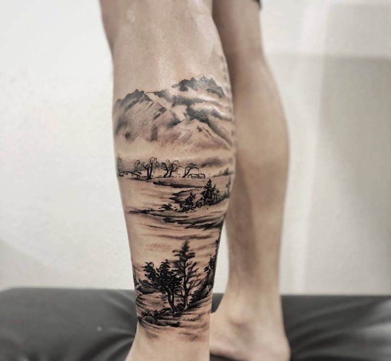 当前位置: 首页 >广东省广州市纹身店-皓龙纹身工作室纹身图案>山水纹身图片_腿部水墨山水纹身图案