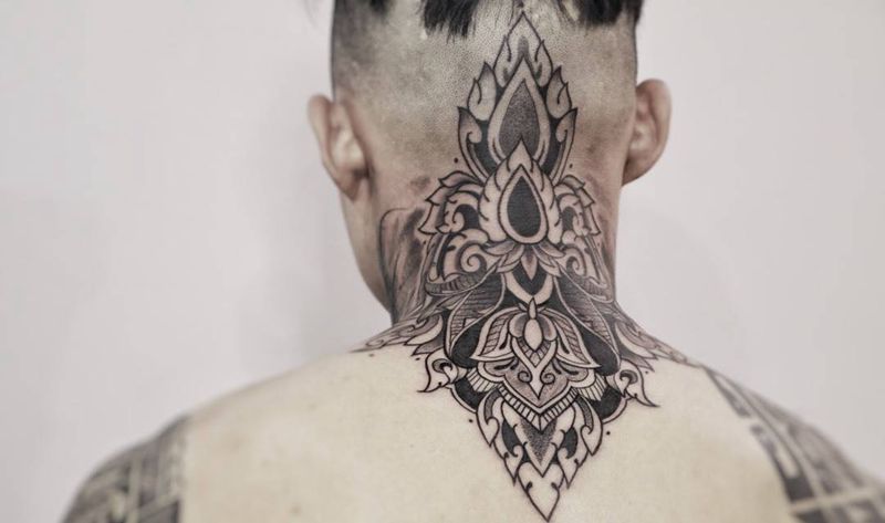 当前位置: 首页 >广东省广州市纹身店-皓龙纹身工作室纹身图案>梵花纹身图片_颈部点刺几何纹身图案