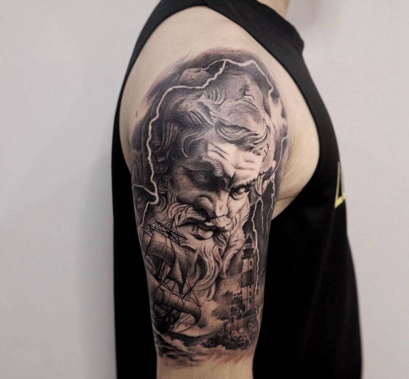 波塞冬纹身图片_手臂欧美写实帆船波塞冬灯塔纹身图案