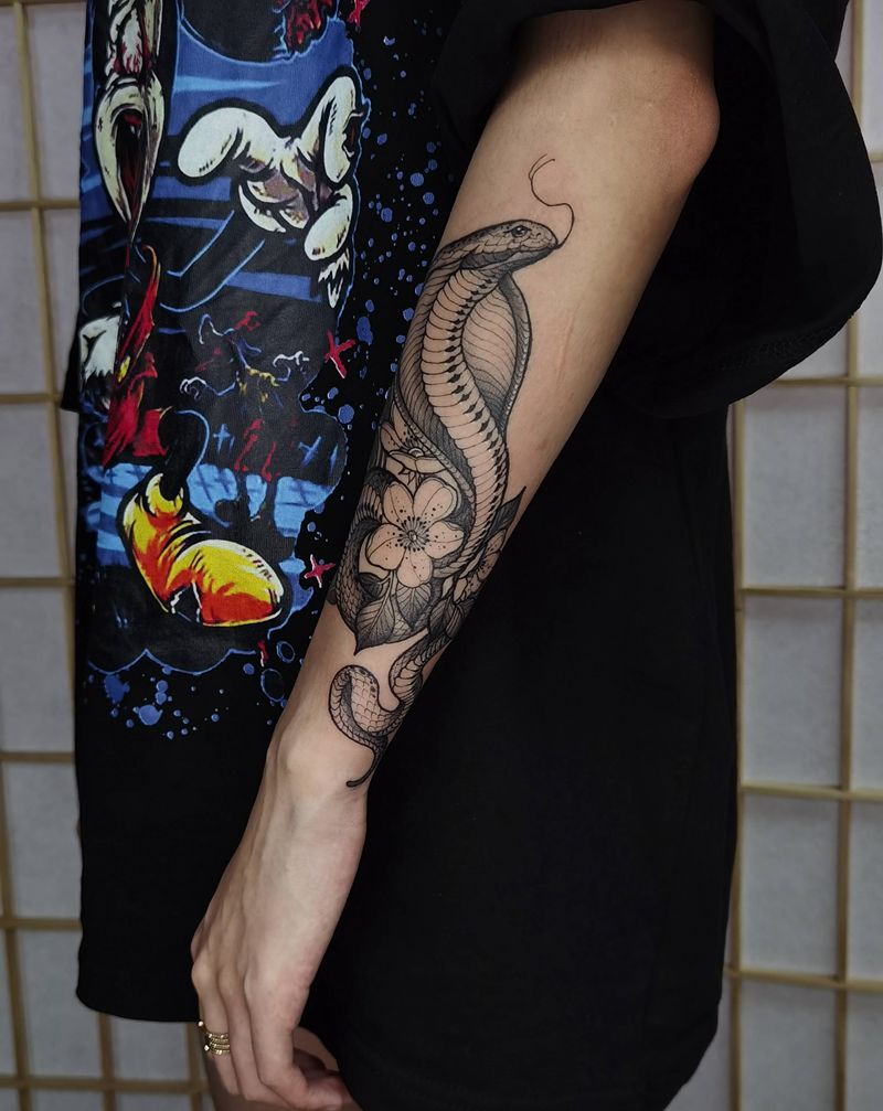 当前位置: 首页 >广东省广州市纹身店-广州匿名者刺青纹身图案>眼镜蛇纹身图片_手部New School蛇花纹身图案