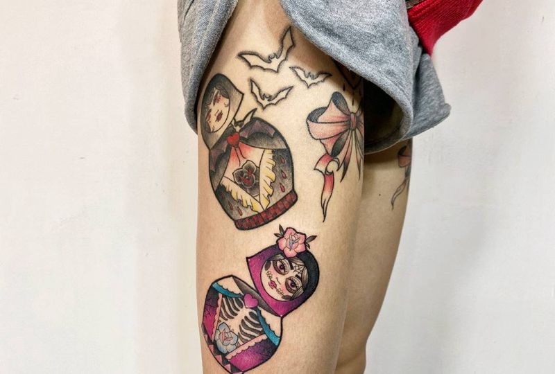 School 俄罗斯套娃纹身图片_腿部Old School俄罗斯套娃纹身图案