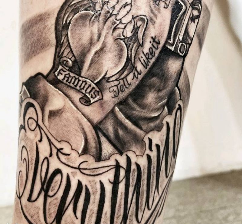 卡奇诺 祈祷之手纹身图片_腿部卡奇诺祈祷手纹身图案