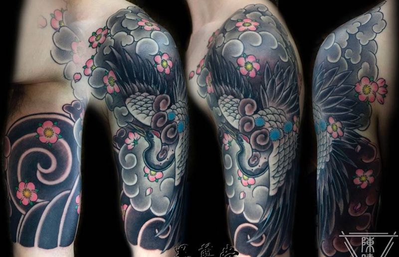 当前位置: 首页 >广东省广州市纹身店-脱白计划·纹身·脏辫工作室纹身图案>鶴纹身图片_成品传统肩部手臂纹身图案