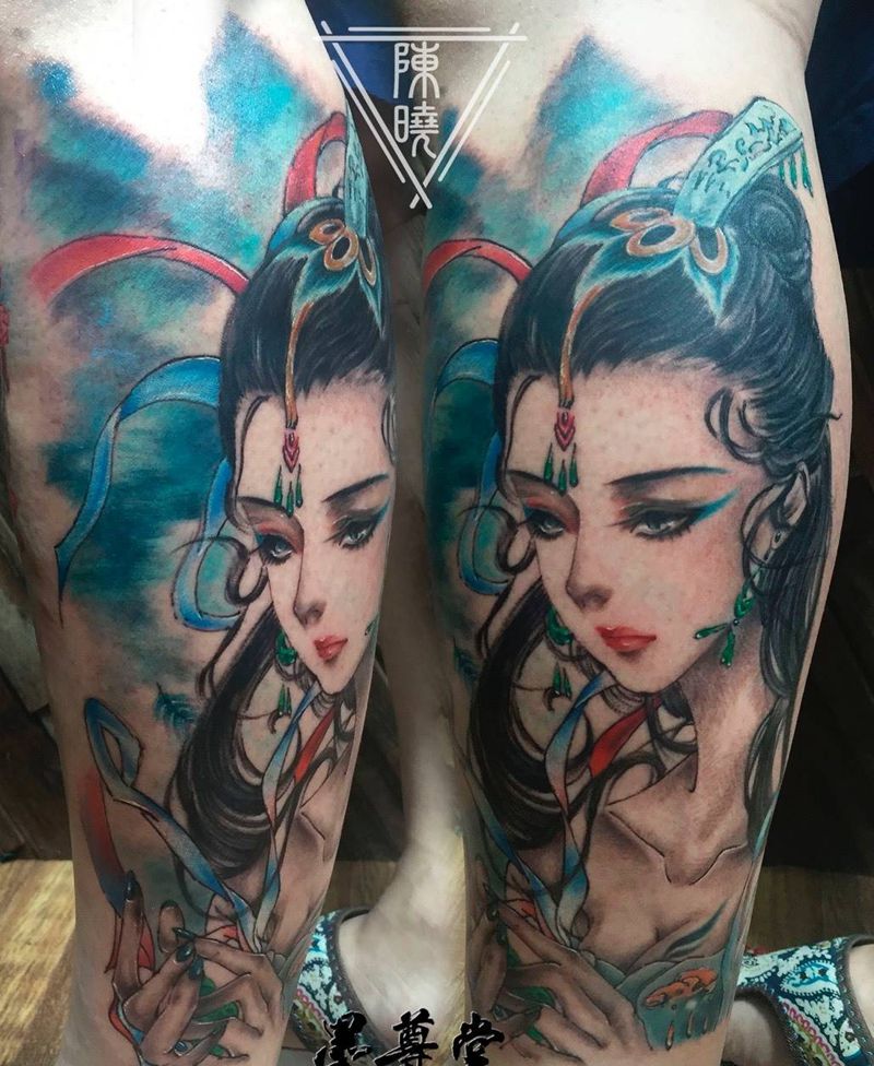 当前位置: 首页 >广东省广州市纹身店-脱白计划·纹身·脏辫工作室纹身图案>古风女纹身图片_腿部脚部传统肖像人物成品纹身图案