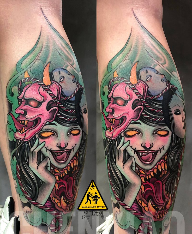 • T包小腿吹火男+阿多福纹身图片_腿部老传统新传统吹火男阿