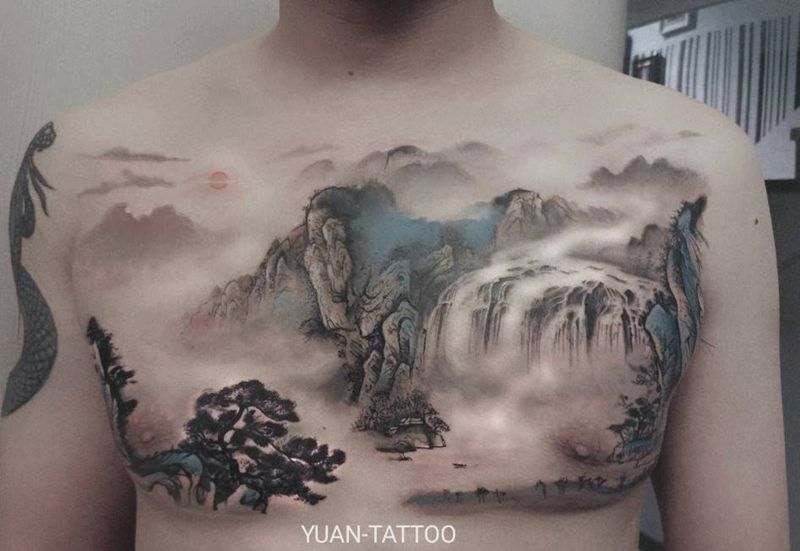 (山中之水) 原创 山水画纹身图片_胸部新传统水墨纹身图案