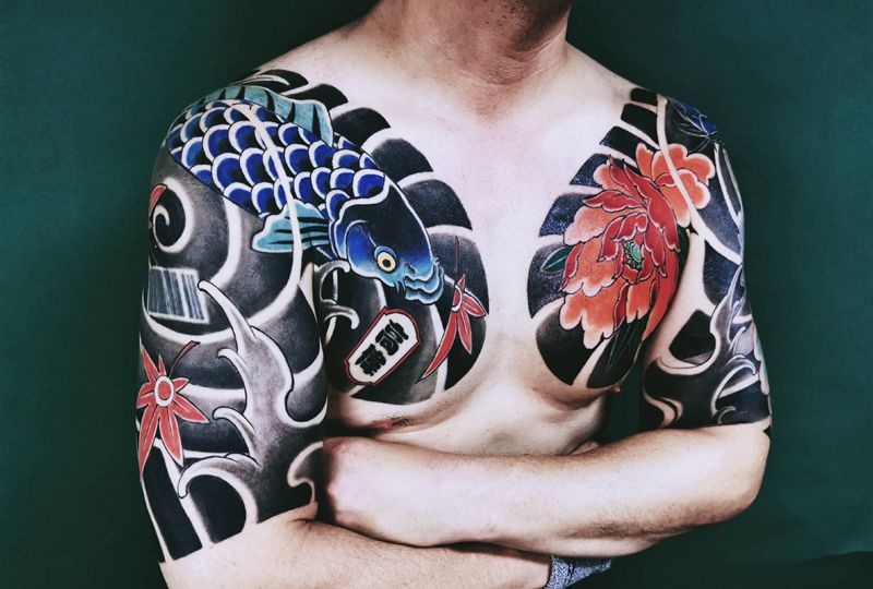 老传统纹身图片_胸部手臂老传统老传统鲤鱼花纹身图案