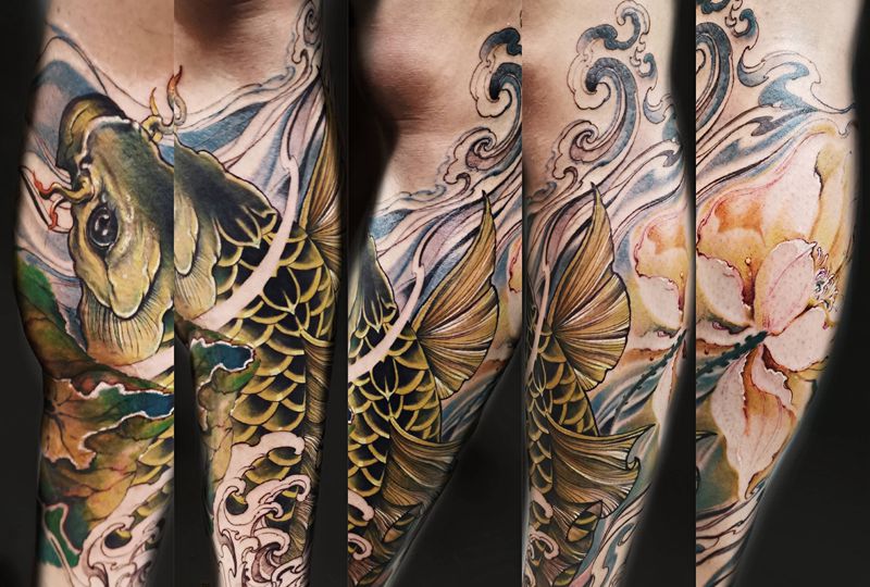 当前位置: 首页 >广东省广州市纹身店-广州匿名者刺青纹身图案>终极遮盖新传统彩色鲤鱼纹身图片_腿部新传统水墨遮盖新传统鲤鱼纹身图案