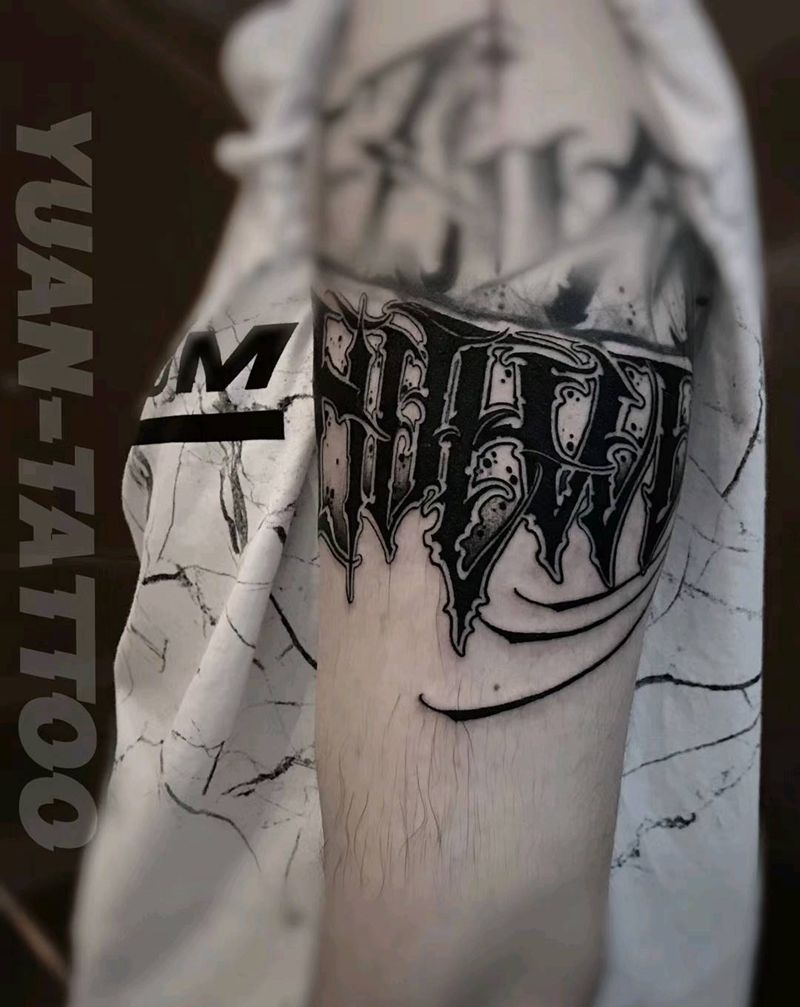 当前位置: 首页 >广东省广州市纹身店-YUAN-TATTOO 元刺青纹身图案>酷纹身图片_手臂花体字纹身图案