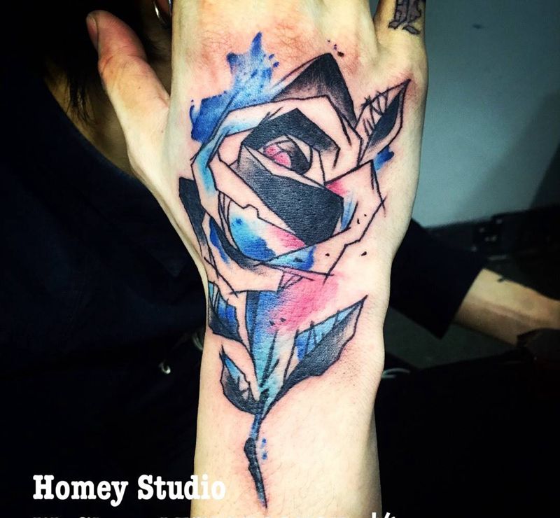• 手背潮流时尚的玫瑰花眼睛纹身图案